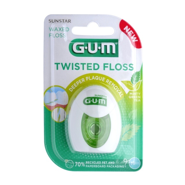 GUM Twisted Floss Minty Green Tea is speciaal ontworpen voor een grondige interdentale reiniging. Deze innovatieve floss bestaat uit twee in elkaar gedraaide draadjes die zich tijdens het gebruik uitzetten voor een betere grip en maximale tandplakverwijdering, zelfs op moeilijk bereikbare plekken tussen tanden en kiezen.
